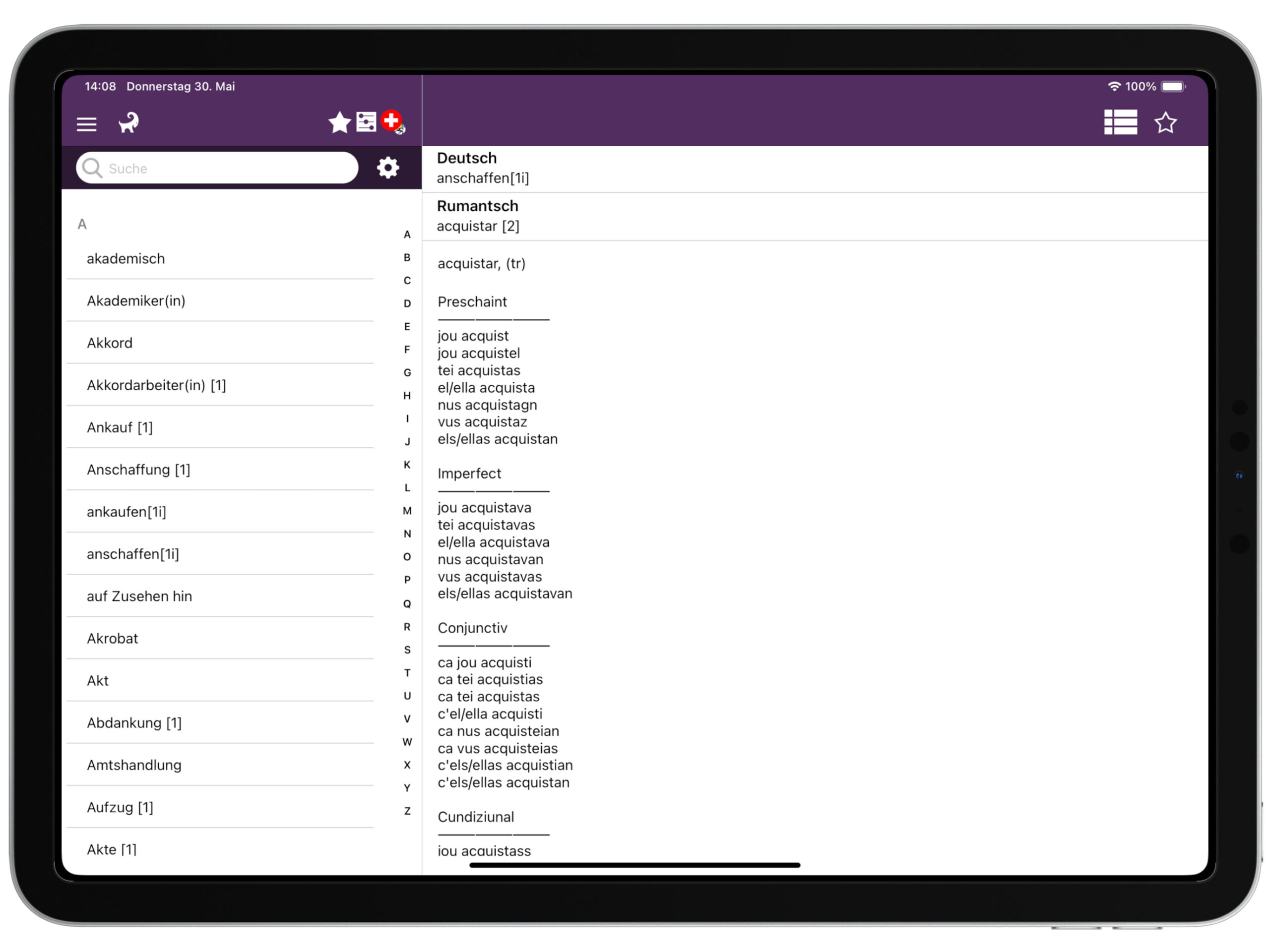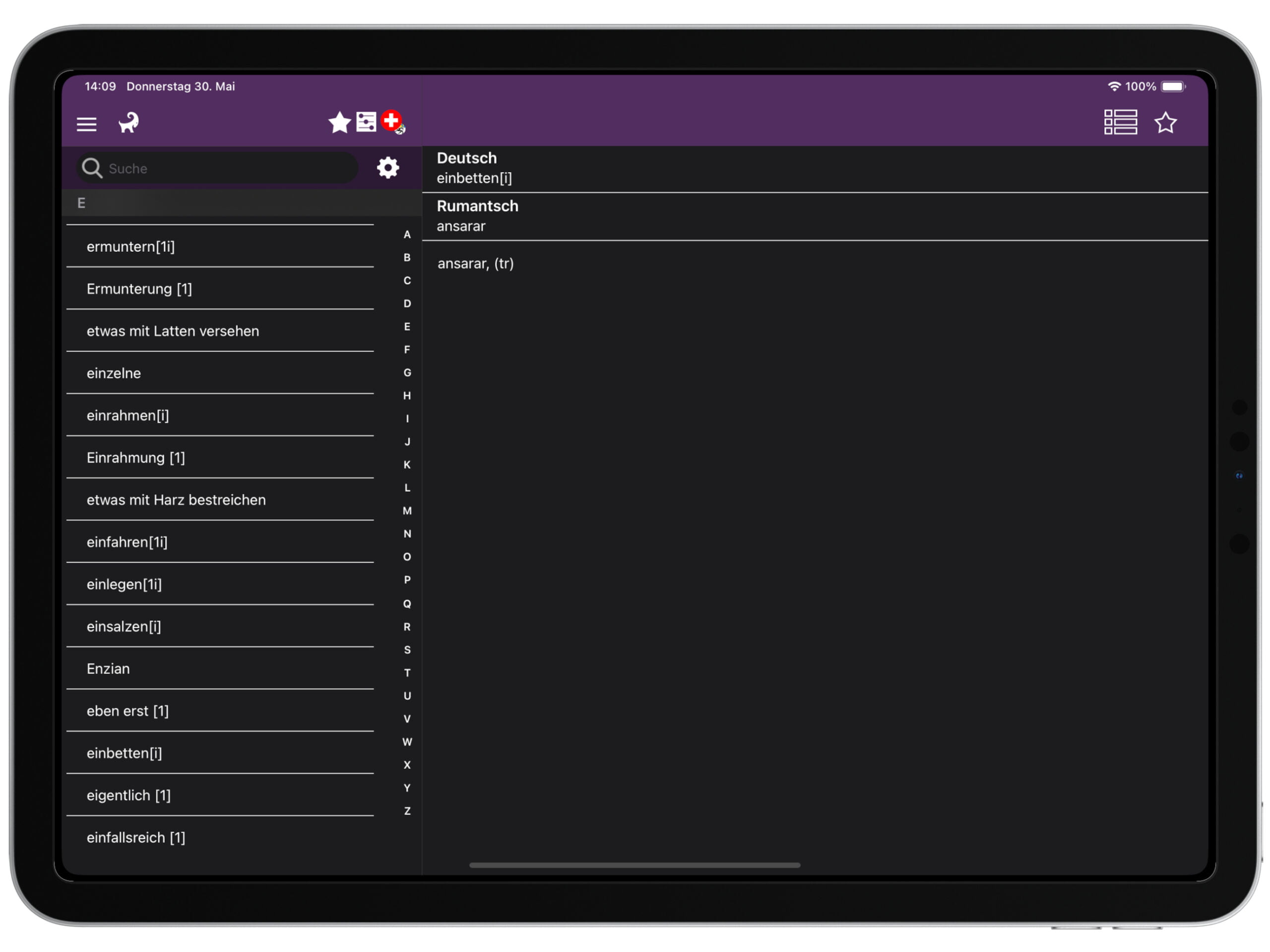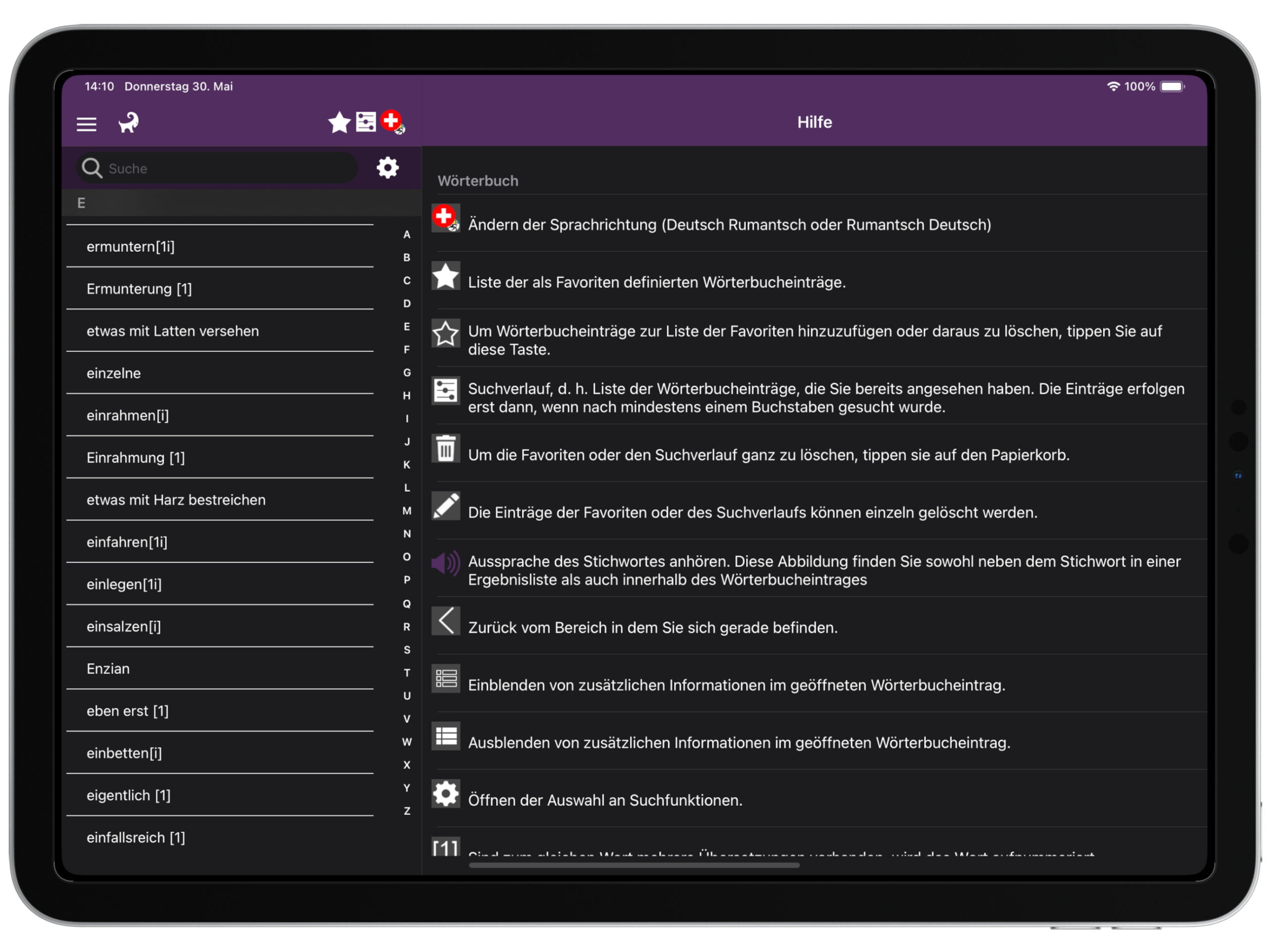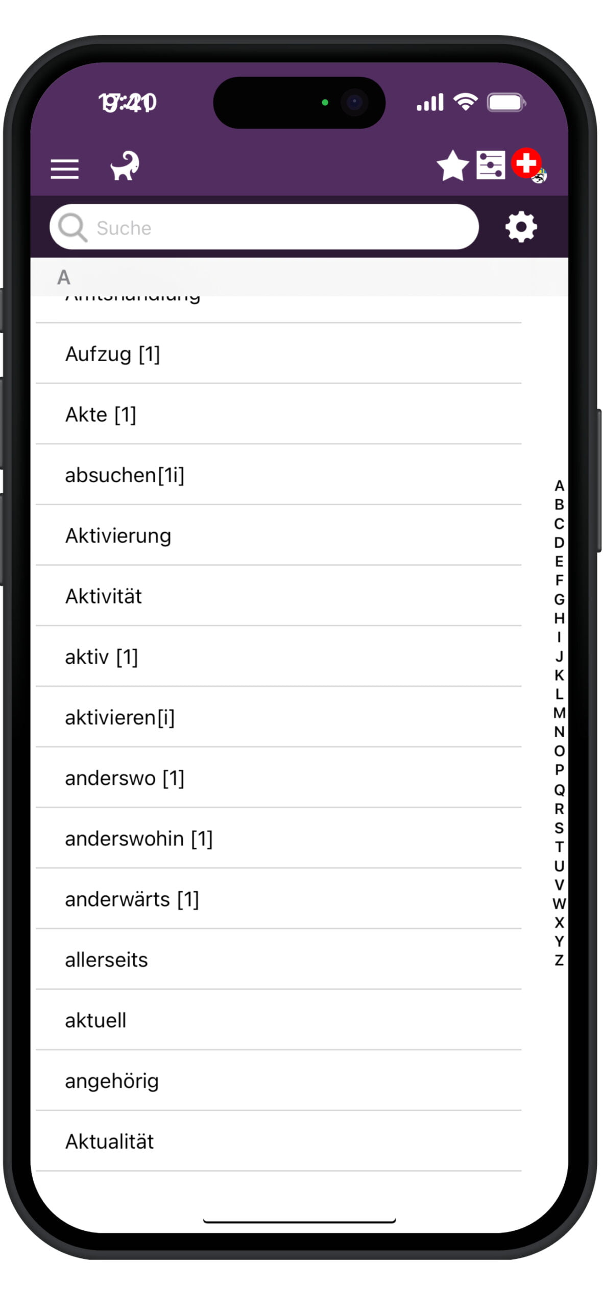 - Schnelle Navigation durch das Alphabet: Mit einem einfachen Wisch können Sie über die SCHNELLSUCHE direkt zur gewünschten Wortgruppe springen.